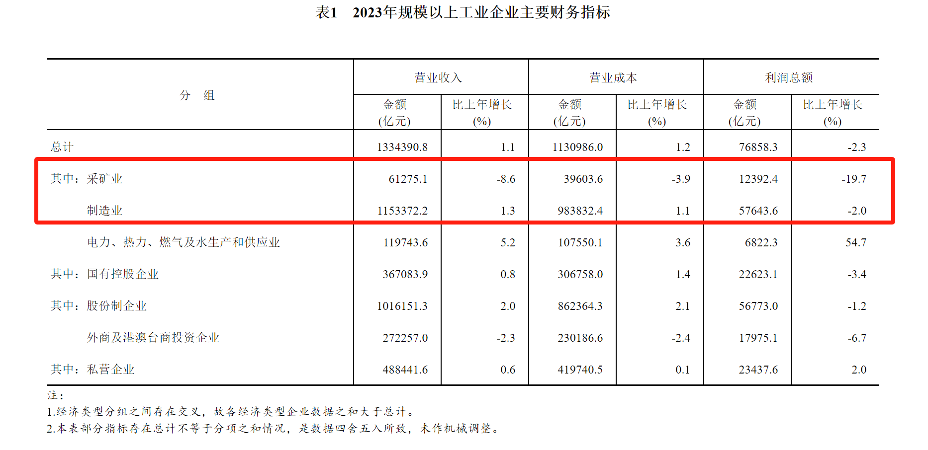 2023年,全國(guó)規(guī)模以上工業(yè)企業(yè)實(shí)現(xiàn)利潤(rùn)總額76858.3億元,比上年下降2.3%,降幅比1—11月份收窄2.1個(gè)百分點(diǎn)(按可比口徑計(jì)算,詳見(jiàn)附注二)。