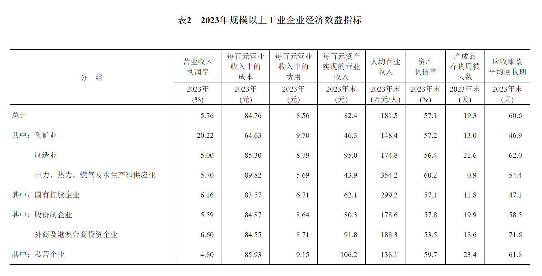 2023年,規(guī)模以上工業(yè)企業(yè)實(shí)現(xiàn)營(yíng)業(yè)收入133.44萬(wàn)億元,比上年增長(zhǎng)1.1%;發(fā)生營(yíng)業(yè)成本113.10萬(wàn)億元,增長(zhǎng)1.2%;營(yíng)業(yè)收入利潤(rùn)率為5.76%,比上年下降0.20個(gè)百分點(diǎn)。