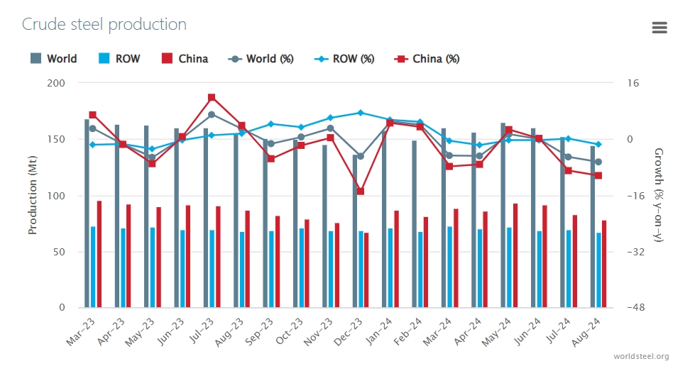 2024年8月全球71個納入世界鋼鐵協(xié)會統(tǒng)計國家的粗鋼產(chǎn)量為1.448億噸,同比下降6.5%。