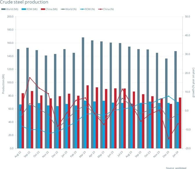 2024年1月全球71個(gè)納入世界鋼鐵協(xié)會(huì)統(tǒng)計(jì)國家的粗鋼產(chǎn)量為1.481億噸,同比下降1.6%。