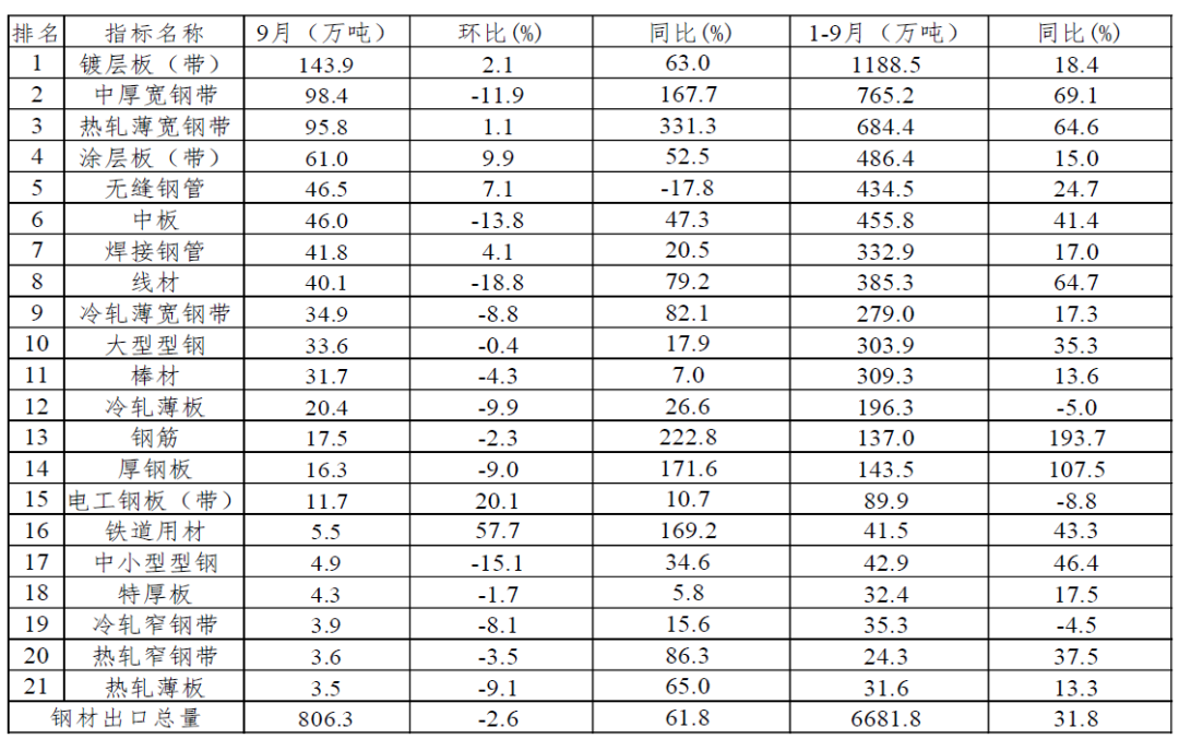 9月,我國鋼材出口環(huán)比回落,但仍處于800萬噸以上高位。出口量最大的鍍層板保持平穩(wěn)增長,熱軋板卷、中厚板、冷軋板卷出口量均環(huán)比回落。對南美主要國家出口環(huán)比明顯減少。具體情況如下: