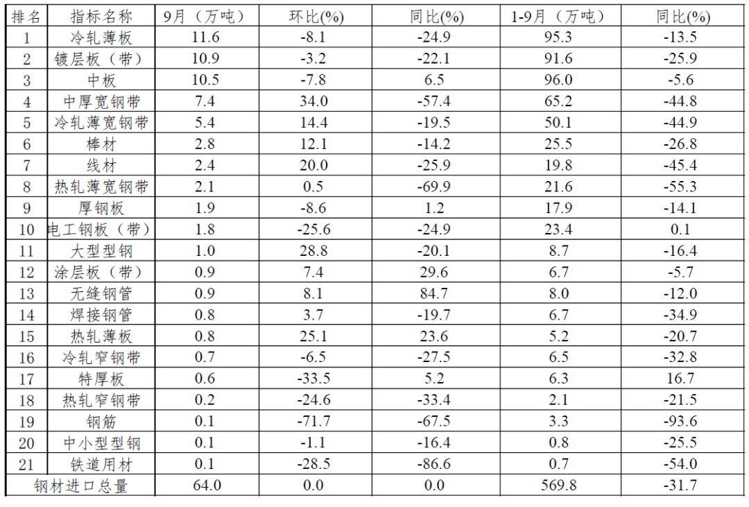 表3 2023年9月分品種鋼材進(jìn)口情況