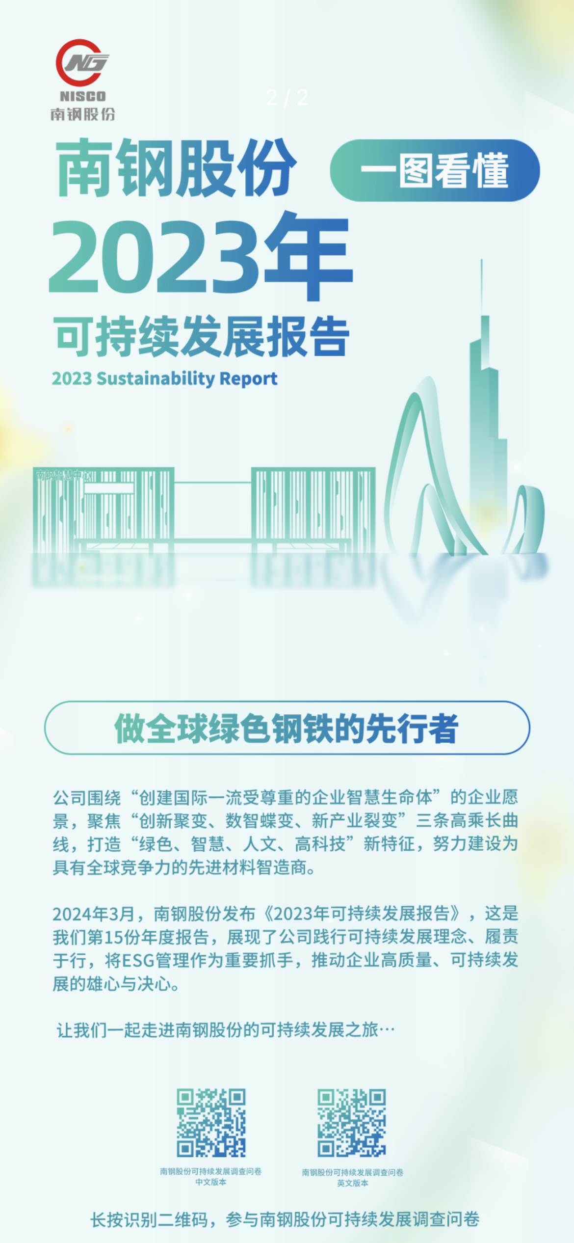南鋼致力于“做全球綠色鋼鐵的先行者”,已多年堅(jiān)持可持續(xù)發(fā)展戰(zhàn)略、踐行ESG管理與實(shí)踐,堅(jiān)持“環(huán)境友好、立業(yè)為善”的理念。(1)在公司治理方面,2021年,公司將董事會下設(shè)的“戰(zhàn)略委員會”調(diào)整為“戰(zhàn)略與ESG委員會”。2023年,公司成立低碳與能源戰(zhàn)略委員會,統(tǒng)籌協(xié)調(diào)公司低碳與能源推進(jìn)工作。現(xiàn)已建立覆蓋決策層、監(jiān)督層、執(zhí)行層各個層級,分工負(fù)責(zé)、權(quán)責(zé)清晰的ESG管理架構(gòu)與制度;積極開展與利益相關(guān)方的溝通,滿足合理訴求。同時(shí),以利益相關(guān)方重點(diǎn)關(guān)切作為公司重要風(fēng)險(xiǎn)和機(jī)遇,發(fā)起“南鋼可持續(xù)發(fā)展問卷調(diào)研活動”,強(qiáng)化公司風(fēng)險(xiǎn)管理。(2)在環(huán)境保護(hù)方面,針對氣候變化等重要議題,公司按照源頭減碳、過程降碳、末端固碳的總體思路,實(shí)施“碳十條”行動綱要和六條技術(shù)路線,并重點(diǎn)構(gòu)建“N-ZERO”零碳三大體系。公司從創(chuàng)新綠色產(chǎn)品、創(chuàng)新綠色低碳技術(shù)、優(yōu)化能源結(jié)構(gòu)、參與低碳標(biāo)準(zhǔn)制定、布局廢鋼資源、綠色物流、綠色投資等多方面、多渠道踐行減碳。公司通過“有組織”“無組織”“清潔運(yùn)輸”的全流程、全工序超低排放改造,成功創(chuàng)建江蘇省“長流程”鋼鐵行業(yè)首家“環(huán)??冃級企業(yè)”。日前,南鋼儲能項(xiàng)目正式竣工并網(wǎng)運(yùn)行,這是國內(nèi)單體功率最大的用戶側(cè)儲能項(xiàng)目。(3)在社會責(zé)任方面,公司堅(jiān)持科技創(chuàng)新驅(qū)動產(chǎn)業(yè)發(fā)展,研發(fā)投入占比連續(xù)多年保持3%以上。創(chuàng)新打造以高強(qiáng)、耐磨、耐蝕、復(fù)合板為核心的全生命周期低碳產(chǎn)品;助力鄉(xiāng)村振興,通過捐資助學(xué)、醫(yī)療援助、消費(fèi)助農(nóng)等方式為定點(diǎn)幫扶地區(qū)鄉(xiāng)村振興工作賦能。自2018年以來,連續(xù)6年開展“星光合伙人”全國鄉(xiāng)村醫(yī)生健康幫扶項(xiàng)目;推進(jìn)深層次產(chǎn)城融合,公司打造了鋼鐵博物館、霸王山紀(jì)念館、江邊生態(tài)濕地園等一批景點(diǎn),助推“工業(yè)+旅游”融合發(fā)展。