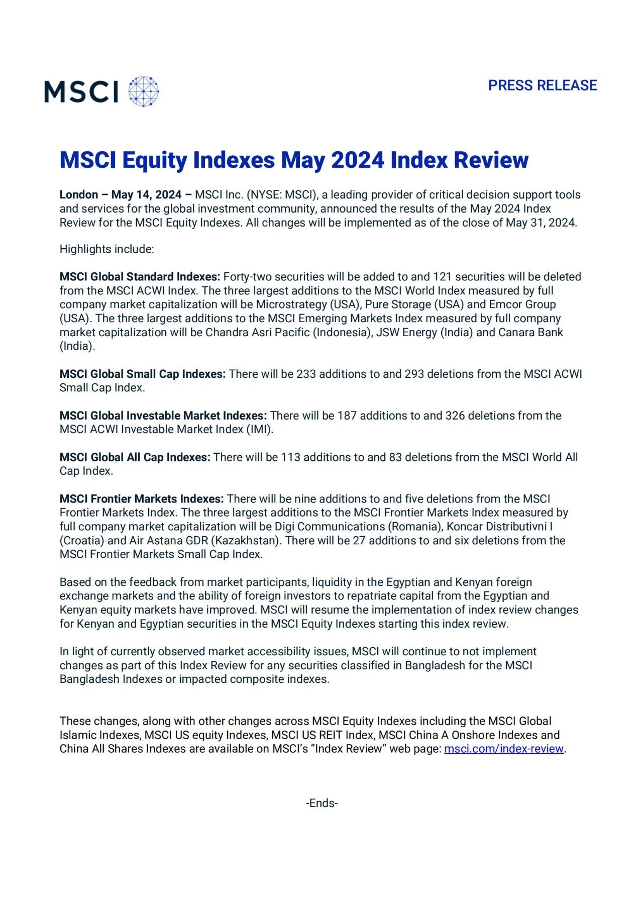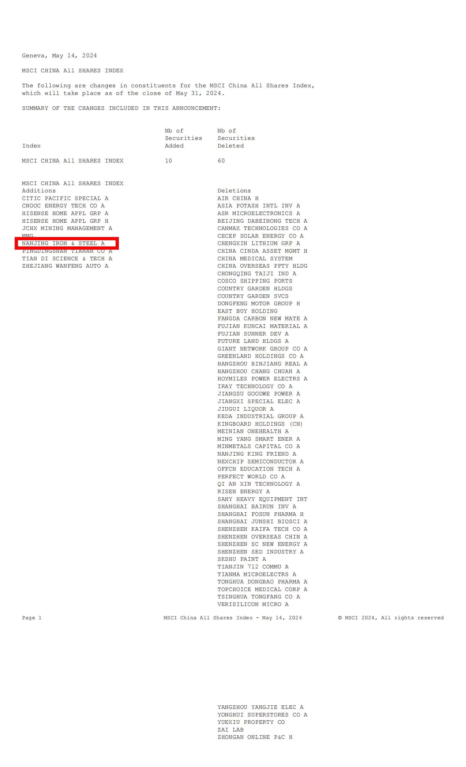 5月15日,國際指數(shù)編制公司MSCI公布了其2024年5月的指數(shù)調(diào)整結(jié)果,本次調(diào)整結(jié)果將于2024年5月31日收盤后生效。此次MSCI指數(shù)調(diào)整新增8只A股股票名單中,南鋼股份名列其中。