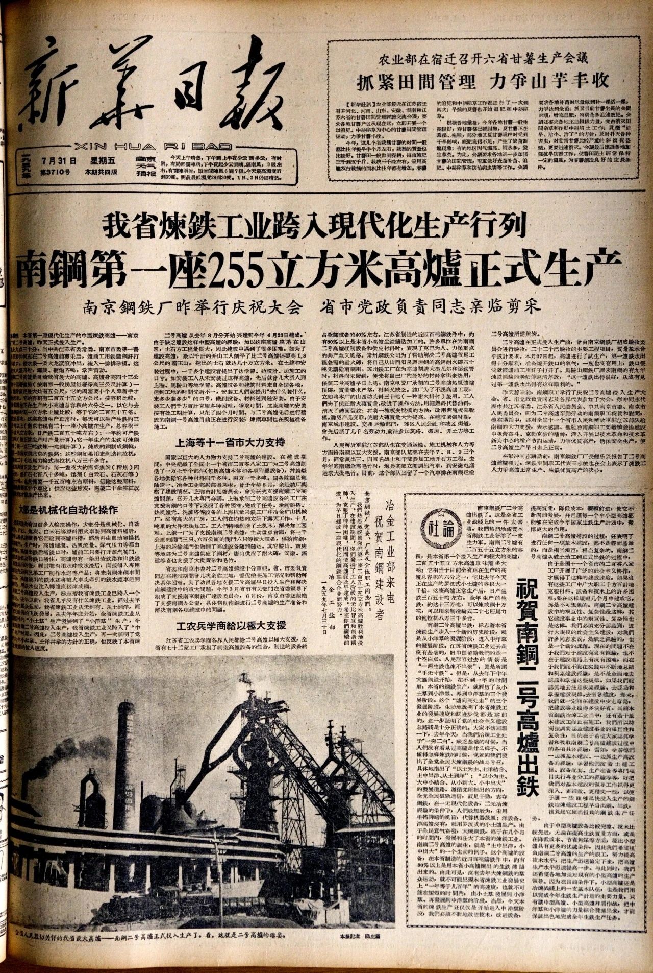 1959年,南鋼2號高爐出鐵,結(jié)束了江蘇省沒有現(xiàn)代化高爐煉鐵的歷史。《新華日報(bào)》頭版整版報(bào)道南鋼2號高爐建成投產(chǎn)。