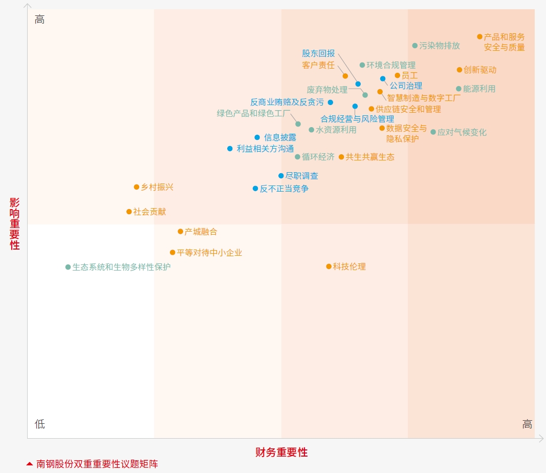 南鋼股份設(shè)立“環(huán)境友好、治理一流、科創(chuàng)引領(lǐng)、共生共贏”的 ESG 戰(zhàn)略目標(biāo),著力提升 ESG 管理水平,聚焦“創(chuàng)新發(fā)展與卓越產(chǎn)品、共享發(fā)展與員工成長、綠色發(fā)展與環(huán)境友好、公司治理與共贏發(fā)展、和諧關(guān)系與社會責(zé)任”五大可持續(xù)發(fā)展層面,為員工謀幸福、為顧客謀發(fā)展、為股東增回報(bào)、為社會擔(dān)責(zé)任、為相關(guān)方創(chuàng)共贏,致力于實(shí)現(xiàn)“創(chuàng)建國際一流受尊重的企業(yè)智慧生命體”的企業(yè)愿景。